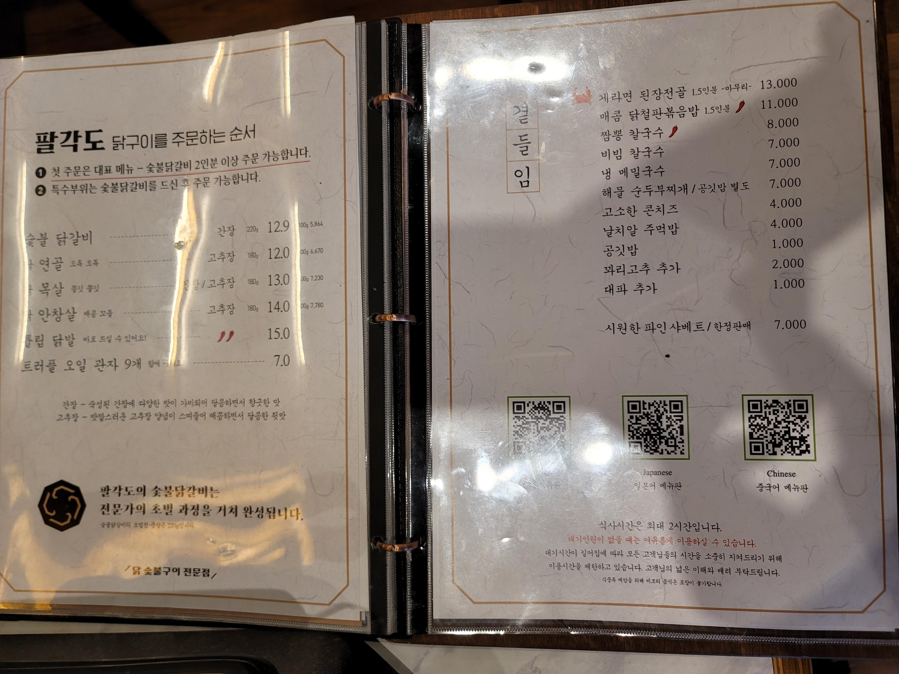 식당에 도착하니 사람들로 붐비고 있었습니다. 깔끔한 식당 내부와 '팔각도' 에서 자랑하는 팔각도 불판이 보였습니다.